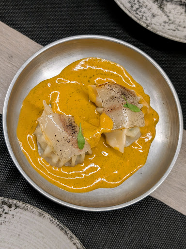 5️⃣-6️⃣ “Dumpling de Gamba y Lardo”. Combinación mar y montaña dentro de una masa muy fina y muy agradable de comer. Terminado en mesa con un gazpachuelo de curry panang. Delicioso. Muy rico.