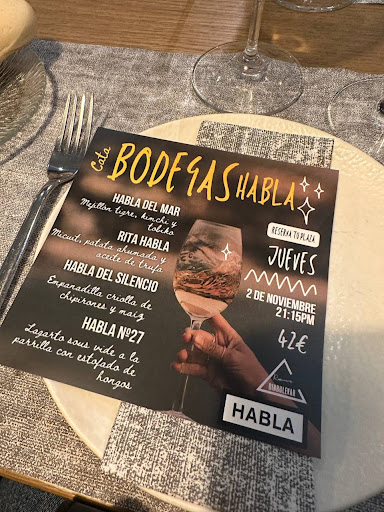 🍤 Mejillón tigre, kimchi y tobiko, con Habla del Mar, un vino blanco con toques marinos. 🪿🍟 Micuit, patata ahumada y aceite de trufa, con Rita Habla, un rosado de corte provenzal. 🥟🦑 Empanadilla criolla de chipirones y maíz, con Habla del Silencio, el vino insignia de la marca. 🥩 Lagarto sous vide a la parrilla con estofado de hongos, con Habla nº27, un tinto elegante y cremoso.