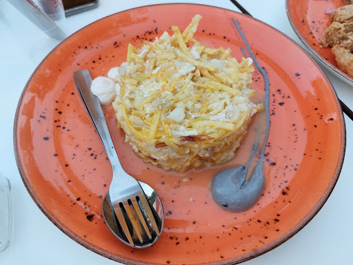 Read moreEstuvimos ayer cenando y la comida no estaba mala pero tampoco destaco nada que te haga volver (si que sorprendió el trocito de bacalao con pisto, digo trocito porque era muy muy pequeño para el precio que tiene (el resto de platos tenían un tamaño normal), que llegó frío, el pisto era de bote y el bacalao no era de muy buena calidad porque no era blanco, era gris, con muchas raspas y muy chicloso, y no se despegaban las lascas bien). Está bien el sitio si vas con niños porque tienen un castillo y la plaza es grande, clientes educados, así que el ambiente muy bueno. Pero sin duda lo peor es el poco personal con el que cuentan, cuando llegamos había un camarero en barra y otro sirviendo en mesa, ya para las once y media o así vimos otro camarero. Estaban sobrevenidos, no podían atendernos bien porque no podían enteramente. Pedías bebida y llegaba a los 20 minutos o así, venían los platos con cuentagotas, del primer plato que llegó al último pasó más de hora y media y eso que primero pedimos para los niños y luego para los adultos que sólo éramos 4. No me importa que me cobren servicio a mesa, pero si se hace es porque tienes un buen servicio, que trajeron el pan con el último plato que se sirvió,.... Para el precio que tiene y servicio que presta prefiero honestamente otros restaurantes, y que, con el pago del servicio a mesa no me siento estafada porque...