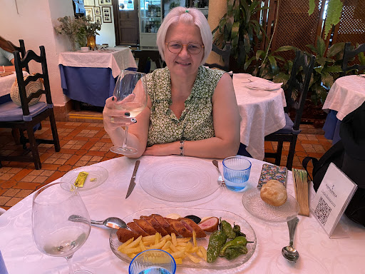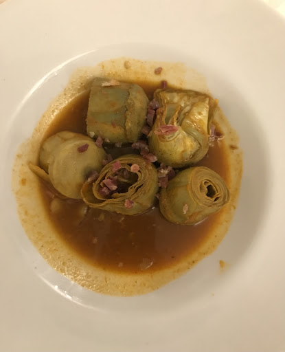 I ordered artichoke and low-temperature hake (see photos) with a glass of white wine (recommended by the waitress.) The artichoke, cooked in the local Córdoba way, was excellent and the portion was generous. But the hake was a let down. It smelled fishy and the accompanying vegetables were not very fresh. They were not very inventive, just carrot and broccoli, but it would have been ok had they been at least fresh. The bit of mashed potato was just alright, nothing to crow about. This was a bit surprising as at Spanish restaurants of this price point, at the very least, the main dish is quite decent. Even the bread was mushy, white sponge, again surprising for Spain.