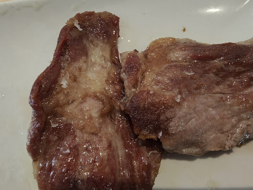Read moreInteresting place, nice vibes. The waiter was rude, looked stressed and annoyed we didn't understand at first what he said in Spanish (we don't speak Spanish and we made it clear by ordering in English), then the other waiter proceeded to forget what we ordered and not bring one dish. The food is tasty, but it's also "flavored" by a ton of salt (see the picture, multiple bits of salt the size of a bug were on the meat). Also for the price you get an incredibly small...