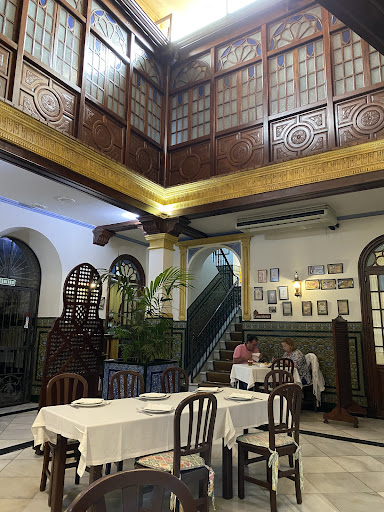 Delicious! A vast menu with meat, fish and limited vegetarian options. The interior of the restaurant comprises a couple of Andalusian patios, with a refreshingly cool temperature on a hot spring or summer day. Their fried aubergine sticks, shrimp in garlic olive oil, gazpacho, bacalao (codfish), lasagna, and the almond cake with raspberry sorbet were all extremely tasty! The gazpacho amongst the best I have tried (one of my favorite dishes so have tried it at many restaurants) and the aubergine sticks had a light, thin and crispy tempura batter, one of the best I have tried as well - often the dough is quite thick and the aubergine as thin as a spaghetti. Definitely worth a visit not only because of the good food but also the neat...