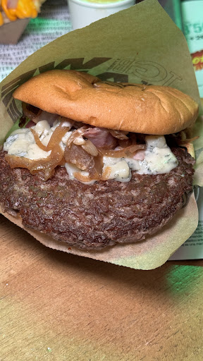 👉 𝘽𝙡𝙖𝙘𝙠 𝙇𝙖𝙗𝙚𝙡 (𝟴,𝟱€) Pan tostado con mantequilla, queso gorgonzola, rúcula, carne jugosa, cebolla caramelizada y bacon crujiente.