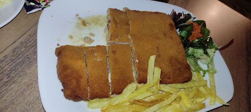 Read moreFuimos por las reseñas de Google, ya que vivimos cerca pero no habíamos estado nunca. Y muy bien, la atención fantástica, muy amables, aunque tardaron un poco en tormarnos nota. Hacía mucho calor y estaba lleno, así que es normal. Pedimos un San Jacobo, que estaba espectacular, grande y rico, y "pechuga de pollo gratinada", este plato nos gustó un poco menos, porque estaba algo salado de más y la pechuga demasiado hecha. En realidad es un rollo de pechuga de pollo entollada en bacon y al horno, nos lo explicó el camarero, aunque yo lo especificaría en la carta ya que pasa un poco desapercibido. En resumen, todo muy bien y a buen precio. Repetiremos. PD: un poco más de queso en el San Jacobo, nos explicó el camarero que es cheedar, pero en el San Jacobo ya hecho se derrite y...