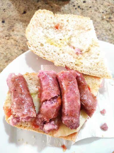 Paramos a mitad de camino para comer unos bocadillos. Nos dijeron que en la mesa no podía ser así que nos fuimos a la barra. Pedimos unos de longaniza brasas con queso y tomate y en mi opinión la longaniza está hecha igual que la hago yo en la sartén de mi casa (ver foto). Si el pan es de ayer podrían al menos tostarlo, el queso semi y el tomate brilla por su ausencia.