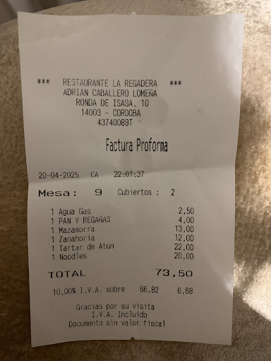 Read moreWe dined twice at Regadera while in Cordoba and found it fabulous on both visits. The staff are friendly, courteous and helpful with menu choices. On our first visit we had the tuna meatball special which was tasty and beautifully presented. We also enjoyed the Butterfish dish and the warm asparagus salad. On our second visit we tried the Almond Mazamorra. It was our first experience with this type of soup and it was divine! A truly inspired paring of flavors between the bites of sardine, roe, almonds, and lime sorbet! My husband ordered the veal meatballs with couscous and the flavors were superb. The leek tart with the duck was perfect and the sauce robust. We shared dessert on both occasions and had the lemon with sponge cake and meringue on our first visit and the apple crumble with meringue and chopped apple inside on our second visit. These are wonderful treats packed with flavor in a beautiful package. This was a...