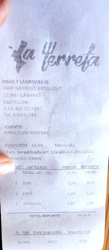 Otra cosa que me habría gustado es que el menú fuese un rango de precios, en vez de poner 12€, estaría mejor indicar 'desde 12 hasta 19' o algo similar, los precios están perfectos pero un poco más de información le daría un punto extra o por ejemplo en la entrada un cartel que ponga 'de lunes a viernes menú de la casa, fin de semana comida a la carta' y para terminar, casi me voy sin tomarme el no cremaet 'espectacular' , otro día volveré a probar el de horchata, pero si tienes algo que no se toma en todos los sitios tienes que anunciarlo o decirlo, sobre todo si el que va a comer no es de la zona de Castellón menos mal que vi a los de la mesa de al lado pedirlo.