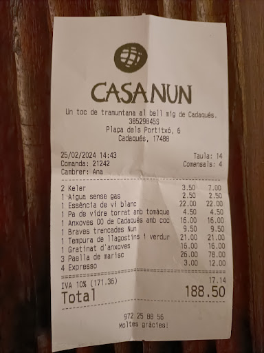 Read moreHoy hemos visitado la localidad de Cadaqués. Teníamos reserva en el restaurante Casa Nun. Hemos llegado puntuales y nos han atendido de manera correcta. La carta del restaurante no es demasiado extensa, por lo que las opciones se reducen bastante. De primeras ya hemos visto que los precios eran un tanto elevados. Por ejemplo, en el postre, oscilan entre los 8 y los 9 euros. Resumiendo: éramos 4 y hemos decidido pedir tres entrantes para compartir y picar y un principal. Los entrantes eran pan anchoas con pan con tomate, patatas bravas y tempura de verduras y gambas. Éste último ha sido el mejor. Las bravas, con huevo para romper estaban bien. Las anchoas buenas, pero el pan no está untado con tomate como se hace en Catalunya. Trituran tomate y se lo ponen por encima. Untar pan es otra cosa. Es coger un tomate y cortarlo para después pasarlo por el pan. Entre el entrante y el principal ha pasado un poco de tiempo. Como principal hemos pedido 3 paellas y unas anchoas gratinadas. De las anchos no podemos decir nada. Pero de la paella.... Para empezar, llevaba, según ellos, una mahonesa de gamba (sabor más que dudoso) que más que aportarle algo lo quitan a uno las ganas de comerla y de pagar los 26 euros por persona que pagas. Salvado ese incidente observas que la paellera no es bajita. La altura de arroz es algo elevada. Por ello, no sale al punto. Si a ello le sumamos que cuando la hemos servido no humeaba, nos hace pensar que desde que la han sacado del fuego hasta que ha llegado a la mesa ha pasado algún tiempo. Puedo asegurar que hubiera tenido que humear porque antes de marchar, han servido otra que si lo hacía. La nuestra era una cataplasma. Pero aún hay más. Una cataplasma sosa, sin ningún sabor. Sosa a matar. No tenía ningún aliciente. Llevaba calamar y por encima gambas (de las peladas) que ni si quiera habían estado en el sofrito. Un competo horror carísimo! Hemos decidido comentar lo sucedido y nos han dicho que lo sentían. Pero el remate ha estado con los cafés. 3 euros por café!!!!!! No recomendable para nada. Os adjunto el ticket de hoy para que veáis que no miento. Un ticket en el que no hay postres (nos hubiéramos tenido que vender un riñón para pagar), pero si sale un cargo de 12 euros por 4 cafés.... Ahí lo dejo. Aprovecho a hacer otro comentar dado que des del restaurante han tenido la amabilidad de responder. En primer lugar, no se lo creen ni ustedes que esa cantidad de tomate en el pan provenga de tomate de untar. Todos sabemos que el tomate de untar funciona bien si está maduro, pero su pan no llevaba ese tomate. Respecto a la gamba que dicen que es de Palamós, pues no sé qué decirles. Bueno si. Que si hacen el fumet con ella, como me ha respondido, le voy a decir que mejor cambie el producto. La gamba, al igual que el arroz, estaba SOSA. Fíjese usted que tienen la desfachatez de tirarnos en cara que nos quejamos cuando dejamos la paella vacía. Pues si. Porqué si hubiéramos hecho lo que usted dice en la respuesta, no nos hubieran cambiado nada. Teníamos que comer y era una paella que costaba 80 euros ... Ahí lo dejo. Y ya, sobre el café..... Que es la calidad dicen. Claro debe de estar allí Juan Valdés con el burro. Por favor. No nos tomen el pelo. Invito a quienes lean esta reseña que lean reseñas de TripAdvisor. Como he dicho antes, ahí lo dejo. Casa Nun, lo único que les puedo decir es que no tienen derecho a sacarme los colores en su respuesta. Deberían aprender a hacer mejor las cosas. Vender humo no lo puede...