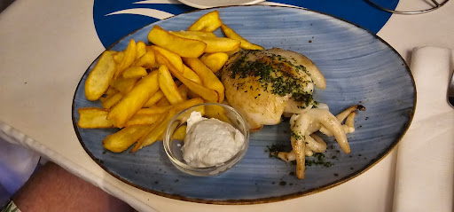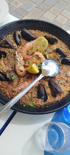 Tourist trap restaurant, pseudo rich: First, my girlfriend and I waited exactly 11 minutes outside, being ignored by all the waiters who passed by, all that for a manager (i guess) to finally come and greet us with a haughty air. Then, there are always several tables in the sun and they never do anything to put them in the shade unlike the neighboring restaurants and obviously the indoor places are very limited. There are only two fans (one of which does not work), only targeted at two tables, again, unlike the neighboring restaurants. Although the pella is good, it remains expensive and you can find better in the neighboring restaurants. They fill the glass bottles with tap water to sell it at a higher price. Oh btw : If you want to eat on the terrace, they charge you €3.75 for it.