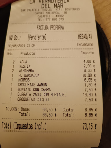 Vivo en Calafell , y normalmente cuando quiero comer una de callos , voy ahí , hacía cuatro meses que no iba , hoy mi madre fue a hacerse las uñas enfrente de la vermuteria y mientras me fui a comer mis racione de callos , decir que estaban impresionantes , como siempre , primero he pedido una de cabrales y un vermú , en la terraza , me los sacaron , y estuve esperando más de 10 minutos a que me dieran los cubiertos , luego entre dentro y me pedí dos cervezas y la callos , también tuve que esperar los cubiertos y el PAN. , por qué unos callos sin pan , no son callos , aún no había terminado que he pedido la cuenta y cuál a sido mi sorpresa , me querían cobrar el pan aparte , por dios , callos sin pan , le dije que si pedía una hamburguesa el pan lo cobraba parte ? Me contestó que no , pues los callos sin PAN , no son callos , cuando me quejé , la camarera se puso de malos modales , insultando , levantado la voz , y de muy mala maneras y le dije , llama a tu jefe , y hablo con el , hizo como que voy a llamar y reculo y me medio amenazo o quería asustarme , que su jefe era peor que ella , a lo que le dije que no iba a pagar el PAN , y dije que llamara a los mossos de escuadra , como repetí que no pagaba el PAN , ella se abalanzó sobre la mesa de malas formas y quitó la cesta del pan , a lo que yo le contesté que si no devolvía el pan , no pagaba los callos , pues como he dicho , callos sin pan , no son callos …. Fue entonces cuando reaccionó de peores formas y fue a cobrar y devolvió mis cambios sin cobrar el PAN , al levantarme para irme , lo mínimo que me dijo fue que era un viejo amargado , ella y su jefe , ya saben la pieza que es y tienen ahí trabajando . Por supuesto nunca más volveré , mientras esté esa señoría ahí . Las compañeras muy amables y simpáticas , ella , uffffff , no entiendo cómo está trabajando ahí . NO RECOMENDABLE . NOTA : los callos...