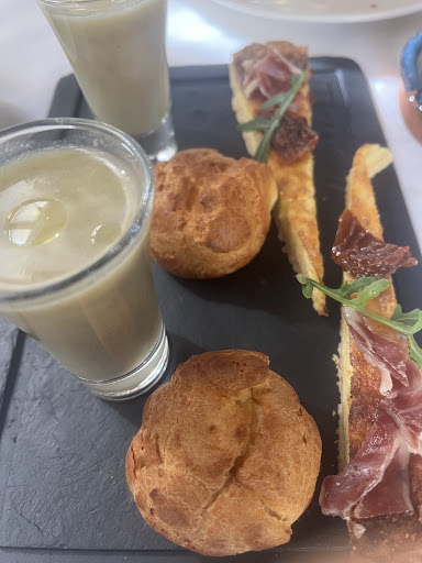 Read moreComida de gran calidad, cantidad y muy bien presentada, pero no me han enamorado excepto los postres, así que no puedo poner un 5. Ensalada de l'hort sosa, le faltaba algo para alegrarla. Canelones veganos igual. Con trufa o ceps quizás estarían mucho más sabrosos. Arròs del senyoret (arroz marinero algo caldoso con gambas, mejillones y pescado) demasiado fuerte, no pudimos acabarlo (cantidad generosa) y nos llevamos lo que sobró. Hojaldre de nata y fresas muy bueno, super crujiente y la nata en su punto de azucar. Brazo de gitano con trufa espectacular. A mejorar el servicio de pan. Sólo sirven 1 tostada por persona, te quedas con ganas de otra para acompañar la comida. Local super acogedor, estuvimos en la terraza cubierta. Muy cómodos y buen espacio entre mesas. Buena sonorización. Parking hay uno publico a 200m antes de entrar en el pueblo. 42€/persona, incluyendo cafes, agua y 1 copa de vino blanco. No es barato pero repetiremos para ver si logramos...