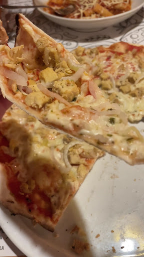 Pizza - wow super thin and crispy, slice it and stands strong no flop or slop, charred undercarriage and prefect hand stretch airy dough! - toppings were nice also fresh thinly sliced onion, marinated small diced chicken and right amount of cheese, one criticism I would have was there was not much tomato ragu base, pretty dry on that front, was there but just not a lot a thin layer maybe that’s how they keep the pizza dough so thin and crispy?