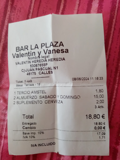 Y a la hora de ir a pagar, los precios son iguales que Valencia, pero… vemos que el nestea no lo han incluido porque dice que no entra en el almuerzo, gracias por avisarlo al inicio. Ah! Y nos cobran almuerzo como sábado y domingo cuando era un lunes no festivo en el pueblo (el Ayuntamiento estaba abierto).