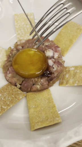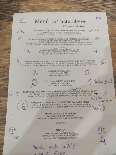 Un 10. Fuimos para celebrar el aniversario de bodas con mi mujer, de hecho ya teníamos pensado ir hace ya tiempo, pero el tiempo, reservas o la ocasión, no daba. En este caso sí. El restaurante es pequeño pero esta regentado por una pareja que te hace pasar una mas que agradable comida. Primero con la introducción por parte de él (ella cocina) es espectacular, te explica sobre todo que lo que cocinan /sirven es producto de proximidad para todos los componentes del menú (actualmente 63€/persona sin iva ni bebida etc). Empezamos con una cerveza (premiada como la mejor del mundo) como aperitivo. Te dan a elegir entre 3 tipos de pan, etc. El menú es completísimo: ademas te ofrecen siempre que, al final, elijas algún plato que quieras volver a probar. Va cambiando platos menos 2-3 fijos que son la estrella: Corvina, Canalón y Nyoquis. Empecemos: Omakase (Sushi elegido por el chef) combinación excelente de arroz de Pals con producto de aquí, mezclas muy interesantes, y eso que no soy muy de sushi. Crema de Gambas de Palamós: Gustosísimo, sorprende las frambuesas secas que dan una combinación perfecta con la crema. Quiche de Calabacin i Parmesano: finísimo, podrías repetir 10 veces, buenisimo. Steak Tartar con Foie i reducción de moscatel: Sencillo, cortado a cuchillo, bien, vino dulce, pasas, con reducción de foie acompañado de palitos de pan. Atrevido, diferente , especial. Va mejorando cuanto más comes, es curioso, pero mejora. Muy rico. Pastel de Corvina: buenísimo, por ello es un fijo en el menú, bien trabajado, no gusto fuerte a pescado sino gustoso pero refinado. Nyoquis: Otro clásico que no cambia en el menú: Tienen unas instrucciones especiales para comérselos, que ya hacen curiosa la experiencia. Cebolla deconstruida sorprende también. Es muy curioso como mejora poco a poco, según vas comiendo. Bikini: Hecho de ternera marinada mucho tiempo para que se deshilache. Aunque cuando lo probamos fue de cerdo, volveremos para probar el de ternera. Muy bueno. Canalón: Excepcional, un clásico de la casa que “simula” un rostit de pato con peras con queso de Olot por encima. Postres: Mandala de xocolate y café: un postre hecho con mucho mimo y muy bueno. Saudade: experiencia (más que un postre en sí) que mezcla libros, postre, música, visita a la cocina. No quiero explicar más, tenéis que vivirlo, lo dejo a vuestra sorpresa. Gracias por seguir hasta aquí, si os ha gustado, por favor un like para seguir “autoanimándome” a seguir comentado...