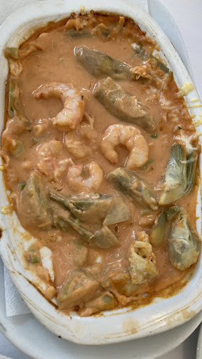 After seeing all the positive reviews we decided to come here. Weâve been served with olives đ« in the beginning, which I accidentally spilled out of the small dish. When we were laughing about it, the head waiter passed by, and said something in Spanish like âmuy bien, perfectoâ. I thought he was joking, but then, looking at his face, I realized he was not, since he didnât laugh and he didnât even clean or asked if we needed help. Then we got the gratin shrimps with artichokes as starterâŠ. The most visually disgusting thing was served (see pictures). Unfortunately wasnât only visually, but the taste was worse than the food in the school canteens. The âgratinâ was made with the worse and cheapest cheese ever, that immediately became like smelly hard plastic. The artichokes were directly from the cheapest can. There were literally 5 unfrozen shrimps (for 12âŹ!!!), submerged in an ugly pink-barbecue like sauce. We left it, the arrogant head waiter came again and asked if we finished already, and I told him the truth. He seemed pretty upset. Iâm not even sure that the cheese was written in the menu, because of course we wouldnât have got that. âGratinâ without other explanation, is a delicate grilled with breadcrumbs. No cheese. Unfortunately the paella came immediately afterwards, because we actually thought about cancel the order and leave. The rice was well cooked, but the fish was clearly cheap, hard, chewy, and unfrozen. Very bad quality. They invested all in the look of the place, so they serve the most low quality food ever. I have no words on how people could gave all those high scores. I havenât eaten bad food like this, literally in ages. Such a bad experience. Probably a âturistâs trapâ, where people who donât know how to appreciate good food go just for the location. And all the waiters are really really nice and kind and smily, except the arrogant head waiter. We left tips for them, definitely not for the...