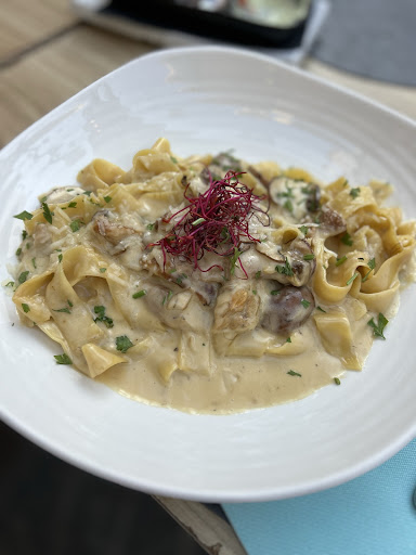 We had started off with bread and dips. I had the mushroom pappardelle, my husband had the carbonara pizza and we had a few drinks. The food was delicious, and hot when it came out. The portions are quite big so we weren’t able to finish our food. Everyone at our table said that they had enjoyed the food and was some of the nicest food we had all week. They had got all of our orders correct and were very organised.