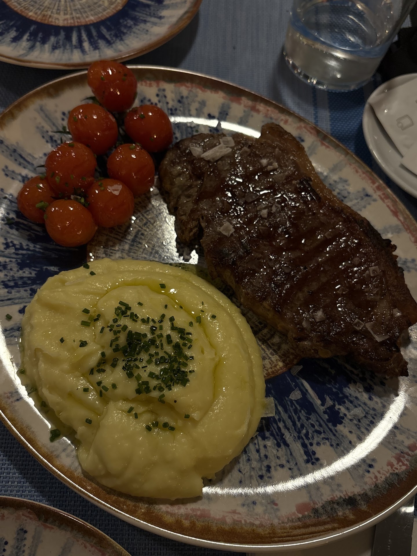 The place is nice and I think they did wonders with the location (it’s a large room with a the entrance and terrace facing a street, with no side openings. Making it look spacious and airy but also cozy was not an easy task and they completely succeeded!). The staff are marvellous, everyone was super nice and attentive, extremely fast and very professional. On the food I’m a bit more critical: both fish were of extremely high quality but the sole was a bit soggy, and the veggies it came with were a pile of seemingly boiled vegetables. The mashed potatoes were very good! The cod was firm and tasty, slightly on in the salty side (there are ways to extract it from the coarse salt crust without passing on the saltiness) but great meat. But then… sitting on a bed on plain, unseasoned rice. The same veggies were on the side. A suggestion: stir fry the veggies so they remain crunchy and their flavour is elevated by the butter, which also makes them glimmer in the light. And if you want to leave the steamed rice put it on the side to create more harmony in the plate. For a visual effect (as the cod is white) I would strongly recommend adding even just a pinch...