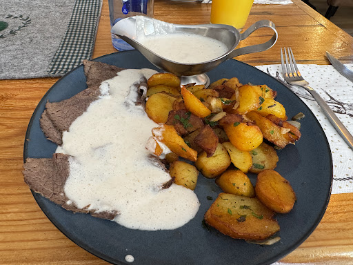 We had the Kaspressknödel with salad and the Salzburger Schnitzel with potatoes. The Knödel was lukewarm and not very tasty. The schnitzel was quite dry and also not super tasty. The potatoes were a little burnt so I couldn't eat them all.