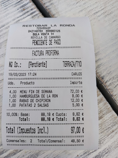 Buscábamos algún sitio nuevo donde comer por la zona de Camargo y encontramos por internet La Ronda , y no nos hemos equivocado . Un bar coqueto ,bien atendido y con tapa de cortesía ,precios buenos no abusivos . En el comedor ,de cuatro mesas en zona de galería posibilidad de carta o menú del día ,vimos la carta ,muy amplia ,muy surtida,muy suculenta y con la intención de probarla el próximo día . Hoy fue menú del día , 18 euros persona por ser fin de semana , cuatro primeros y cuatro segundos para elegir , ensalada de jamón con frutos secos , macarrones con nata y langostinos ,ensaladilla o verduras al horno con queso de cabra . De segundos albóndigas caseras en salsa (traen patatas caseras)cachopos de lomo (con patatas y pequeña ensalada ,pimientos rellenos y huevos rotos . Nosotros nos decantamos por los macarrones y ensaladilla y por los cachopos de lomo y albóndigas ,. La verdad que todo exquisito ,ración muy cumplida ,muy bien especiado y presentado ,hasta la vajilla es bonita, Los.macarrones especialmente ricos ,no es una carbonara pesada ,con un número elevado de la langostinos .Bien atendido , chico muy correcto , el pan le hornean allí mismo y te lo sirven calentito . En el menú incluye una frasca de vino ,gaseosa y agua . El postre ,milhojas con fresas y nata ,dos bocados de placer ,buenísimo y original , el postre no tiene que ser grande ,si no que te deje buen sabor de boca y este ha sido perfecto . Repetiremos y recomendaremos . No se necesitan grandes lujos para salir contentos de un sitio,pero es un lujo encontrar sitios así , Repetiremos...