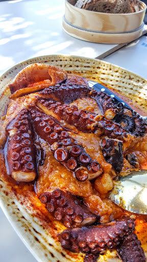 Las tostas no me dicen nada. Te imaginas una tostada de pan más típico gallego, pan denso con miga fuerte para sujetar el montante, y te encuentras con un pan que se rompe. La sardinas anchoadas muy grandes eso sí. Pero la de pulpo con crema de queso san Simón no sabía nada a ahumado.
