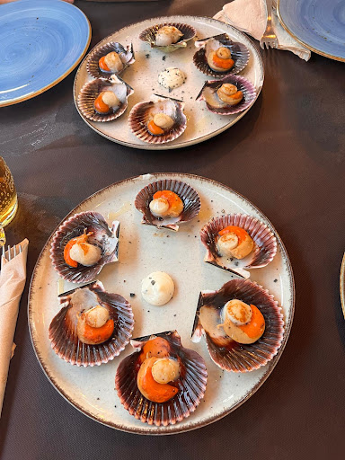 Aunque comimos de una manera decente, tiene sus sombras. Sobretodo la relación calidad/precio. Pedimos dos raciones de zamburiñas, que por supuesto no lo eran, sino vieiras del pacífico. Bien, es difícil fallar al hacer esto en una plancha. Langostinos en tempura, ciertamente el plato más sabroso. Un entrecot y un solomillo, acompañado de patatas congeladas. También pulpo, bastante chicloso.