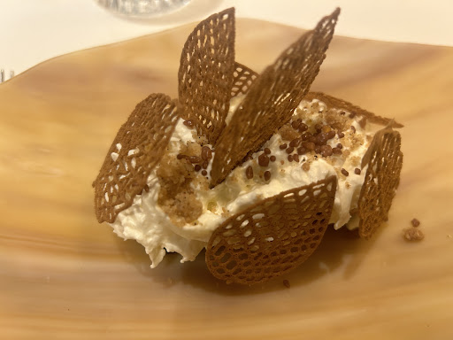 Finalmente, endulzamos la comida con un semilíquido de praliné con helado de vainilla, en un tamaño que resulta un poco excesivo, juntamente con petits fours presentados en un árbol de tenedores y cucharas. En la base de dicho árbol, encontramos unas correctas bebidas a base de cítricos y unas galletas de la fortuna.