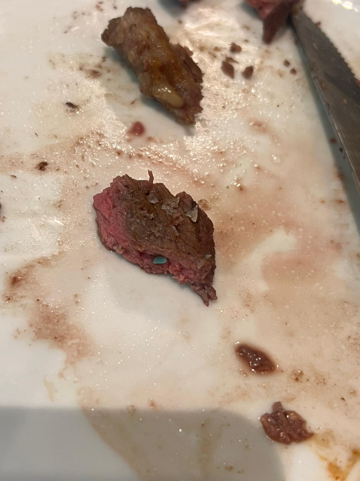 Cuando finalmente llegó, encontramos trozos de plástico verde dentro de la carne. La encargada dijo que eran de la tabla de cortar y, nos comentó que se lo comentaría al compañero de cocina. (No nos daba ninguna solución y no son condiciones de comerse una carne) Finalmente le dijimos que lo retirase y nos diese alguna solución, retiró el plato y no lo cobró diciendo “ Pues la solución es no cobraros viéndoos las caras de molestas”.