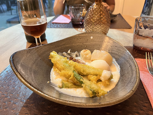 Read moreSe trata de la propuesta de una joven chef, Natalia Segura, una mujer entusiasta que aporta su visión actualizada sobre platos tradicionales con técnicas de vanguardia. Visita 08-02-2025, para el servicio de mediodía un comensal sin reserva, visita a Vic por el Truforum 2025. Son pasados unos minutos después de las 3 de tarde y pedimos para comer. Nos atiende una recepcionista muy agradable y dice que consulta con cocina. Regresa en pocos instantes y nos contesta con un super si. Me acomoda en una mesita con vistas al salón y me ofrece su carta y el menú de temporada de fin de semana, por el que me decanto. “El vermut” cóctel de cava, aperol y vermut y tres vocaditos, su versión de las patatas bravas (me advierten que pueden picar un poco, perfecto) esferificación de aceitunas rellenas de anchoa (sorprende) y tostadita de escabeche. Primeros platos su versión de la escudella, gelé de caldo con sus carnes coronado con un galet, filipino de calçots (una deconstrucción) y para mi el más sorprende, su sopa de ajo, un tranpantojo de un huevo frito, perfecto. De principal un arrocito con guanchale, setas y espárragos en tempura. muy rico. De postre su versión del pastelito de la pantera rosa, me llevo 50 años atrás a mi infancia. Se trata de un menú gastronómico para disfrutarlo y has de darle su tiempo, no pretendas comer en 50 minutos, ese es mi consejo. La atención en todo momento fue perfecta, cercana pero profesional, platos explicados. Servilletas de tela, cubertería, vajilla y cristalería muy chulas. Mención especial al espacio, desde mi ignorancia creo que se trata de edificio gótico civil con 2 grandes “voltas” vistas y un pozo/algibe. Bien situado en el casco histórico, cerca de la catedral....
