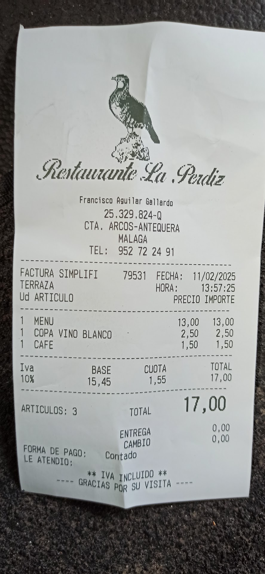 Read moreBueno qué qué decir lo primero decir que yo soy chófer que llevo un camión el menú poco donde elegir tres platos de primero y tres platos de segundo he empezado a comer a la 1 y he terminado de comer a las 2:10 cuando cuando yo empecé había tres personas y cuatro camareros y cuando llega el segundo churrasquito a la brasa pues llega frío y acompañado de unas patatas con un pelo en el menú si pides tinto y gaseosa pues te ponen una botella de tres cuartos de tinto y una de gaseosa de 1 l pero si pidas vino blanco pues te pones una copita y la segunda ya te cobran 2,50 decido tomarme el café en la barra y 5 minutos esperando que apareciera un camarero en la barra en la cocina no sé las personas que abría pero varias pero en el comedor cinco camareros y la barra sin servicio por mi parte un lugar pésimo no lo recomiendo y eso de las fotos que pone ahí en el menú eso no es cierto hoy lentejas salmorejo y sopa de picadillo de primero y de segundo carne al ajillo pez espada...