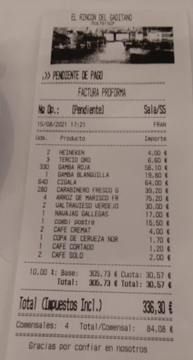 60 euros para dos personas, hemos pedido: 17 euros por unas 20 almejas (Demasiado) 22,50 euros por un lenguado a la plancha. (Decisamente demasiado) 17 euros un frito mixto para dos, eso si que me ha parecido bien porque era una ración abundante y variada en cuanto a tipos de pescado. 1 euro el pan 1,70 una caña 1,70 medio litro de agua natural sin gas