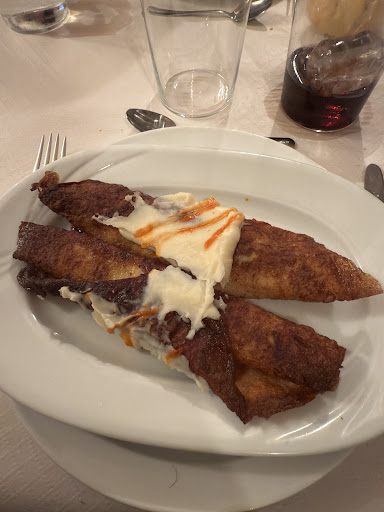 Optamos por el menú del día, que ya de entrada nos pareció muy completo y a un precio más que razonable. La fabada fue un auténtico acierto: bien ligada, con un sabor profundo y contundente, y una fabada de las que invitan a mojar pan sin parar. Después, probamos unos frixuelos de gambas que nos encantaron por su originalidad y el equilibrio entre el dulzor suave de la masa y el relleno sabroso y jugoso. De segundo, el cachopo cumplió con creces las expectativas: grande, bien empanado, con una carne tierna y un relleno generoso, perfecto para los que buscan un plato contundente y auténtico.