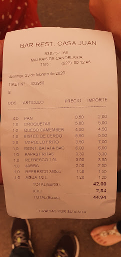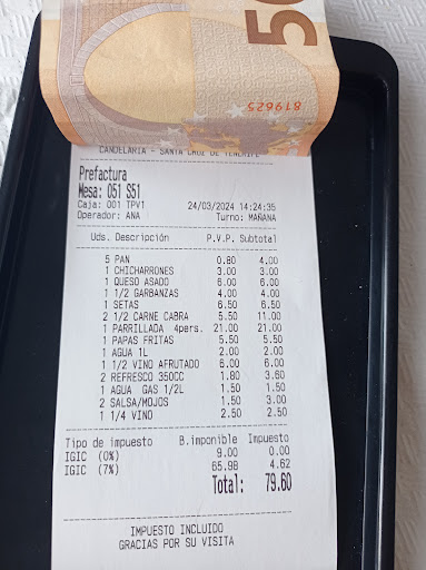 We visited this typical local restaurant for the evening meal. The waiter was very friendly and do his best to explain us the spain menu. We ordered the no. 4 (grilled cheese with mojo sauce [red garlic mojo sauce and green herb mojo sauce]; the no. 9 (grilled mushrooms); No. 47 (Tropical salad with fresh avocado and mango pieces); No. 40 (grilled chicken). My wife ordered a very good white wine which is originated from teneriffa (you can buy a 1 litre bottle for approximately 5 euro - so cheap for that good wine!). I ordered a "dorada sin con limon" radler. The friendly waiter brought us a very tasty free caramel liqueur. For this complete dinner (without the 1 litre bottle) we paid 30 euros! That is nothing for that fresh and tasty food! Very good price/-performance ratio! For sure we...