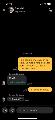 Read moreAnoche hice un pedido en glovo y la verdad que no volveré a repetir, he pagado 26€ por comerme una pizza mediana (da para dos muy justito) resequísima, fría y dura, lo mismo el pan con ajo, todo porque al repartidor Ezequiel Zambrano se le ocurrió entregar tres pedidos a la vez (dicho por él cosa que la asistente de Glovo nos dijo que no constaba como que tuviera más pedidos a la vez) el caso es que ha tardado 50 minutos en entregar un pedido que a lo sumo se tardaría 15. Al llegar el pedido se le preguntó que cómo era posible que tardara tanto y de mala educación dijo “las quejas a Glovo, aproveché para entregar otros dos pedidos” que aunque así fuera, eran por la misma zona entre el restaurante y mi casa (por lo que se vió en el mapa).
