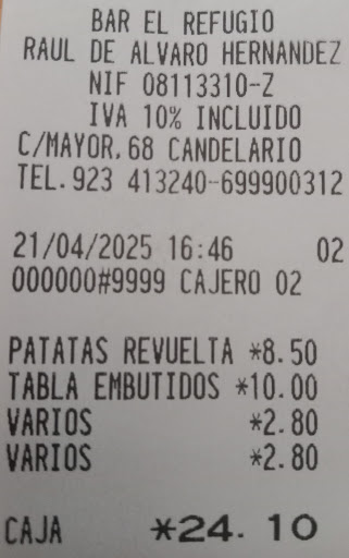 Read moreLunes de Pascua, de retorno de la Semana Santa malagueña vía Ruta de la Plata, decidimos parar -casi cuarenta años despúes-, en Candelario. Casi toda la hostelería cerrada. Tomamos café y manzanilla en la mesa-trillo del Bar El Refugio (tras el reciente paso de un grupo numerosísimo de visitantes: vasos, copas, tazas y platos en abundancia por todo el local y mesas exteriores). Recorrimos el pueblo con detalle y tranquilidad. A las 16:00 regresamos a El Refugio, y preguntamos para comer algo: rápidamente estábamos sentados, con dos cervezas delante y, en poco más tiempo, un buen plato de embutidos y otro de patatas revolconas, meneás o removidas (al gusto). A las ¡16:46 h. ! dejamos el local. Resúmen: trato directo y franco, servicial y atento; embutidos de calidad y en abundancia (parte los llevamos en papel de aluminio para consumo tardío); y patatas revolconas de quitarse el sombrero y aflojar el cinturón. Fotos y tarifa, y que cada...