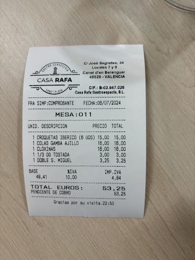 Read moreEl sitio no está mal y la comida está buena, lo único que los precios son un poco elevados para la cantidad que ponen y el tipo de sitio que es,me explico; no deja de ser un bar que no está en primera línea, mesas sin mantel... Vamos, un bar bien, pero precio como un restaurante. Además si pides la ración de arroz del día para llevar son 7€ aprox. Y si lo pides para tomar allí 14,5€ que uno piensa que paga el doble por el servicio y porque que te hagan el arroz in situ en su paella para ti y los que seáis tiene sentido, pero no, te sacan el plato de la misma paella que hacen para llevar y pagar el doble por eso no parece muy coherente. Los postres están muy buenos y los baños muy limpios y con artículos de todo tipo para la higiene. Pero para 30€ por persona que...