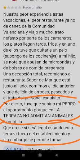 Reservamos mesa en terraza y el encargado nos advirtte que la próxima vez avisemos de que vamos con perro porque 'hay gente a la que le da alergia o le molesta" y nos pondrían una mesa fuera del toldo (bajo sombrilla). Ojo, que me dijo que ahí permitían fumar antes de la pandemia, pero eso no molestaba. Se suponía que yo tenía que entenderlo, pero en 5 años que llevo a mi perro de 7 kilos a terrazas de toda España (muchas veces con el de mi hermana) es la primera vez que me pasa esto.