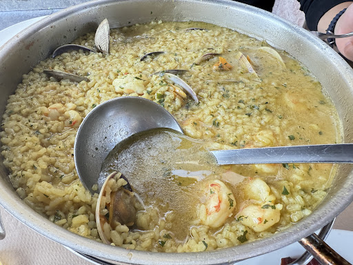 El caldo, por su parte, era pálido y falto de carácter, lo que indica una clara ausencia de sofrito o base de sabor bien trabajada. No se apreciaban notas de tomate reducido, ajo ni ningún elemento que aportara profundidad. Como resultado, el conjunto era plano, sin matices, y los mariscos (gambas y almejas) estaban cocidos pero sin sabor ni presencia destacada.