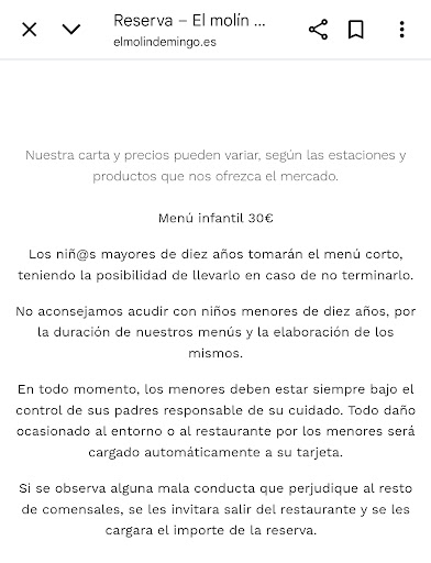 Experiencia muy decepcionante: Restaurante que desde la propia reserva en la web muestra resistencia hacia la presencia de menores. Copio un pantallazo donde puedo entender la recomendación de no acudir con menores de 10 años, pero todo lo siguiente ¨todo daño ocasionado al entorno o al restaurante por los menores será cargado automáticamente a su tarjeta¨ ¨si se observa alguna mala conducta que perjudique al resto de comensales, se les invitará a salir del restaurante y se les cargará el importe de la reserva¨, etc. convierte a los menores en sospechosos por el simple hecho de su fecha de nacimiento. Nosotros somos una familia con 4 hijos (de 17 a 10 años), que fuimos con nuestra mejor ilusión y gran esfuerzo, ya que uno no puede permitirse restaurantes así para 6 cubiertos frecuentemente. A pesar de la ¨hostilidad¨ hacia los menores en la web, aceptamos ir por todas las recomendaciones que teníamos. Una vez allí nos dicen que nuestra mesa no está dentro del restaurante, sino que estamos apartados en el hórreo, donde vamos a estar más cómodos e independientes. Hay que decir que prácticamente todas las mesas están dentro del restaurante. No se trata de una distribución donde te puede tocar en un sitio o en otro... sino que lo normal es estar en el restaurante y algunos casos están fuera. Obviamente no me gustó que me asignaran la mesa fuera y pregunté directamente si esto era así por acudir con menores (dada la experiencia de lo que uno lee en la reserva) y siempre se me negó que era por este motivo, sino por la organización que tenían de las llegadas de los comensales. El Hórreo es un lugar acogedor, de dos estancias, donde nos dieron a elegir cuál preferíamos y aceptamos una de las dos por no seguir resultando demasiado incómodos. Se trata de un comedor bien decorado, pero donde por ejemplo, para ir al aseo hay que salir a la calle (gracias que no llovía), no cuenta con climatización, o tuvimos que comer acompañados de media docena de moscas. Entiendo que es simple casualidad, pero en el otro comedor del hórreo había una familia con un carrito de bebé y justo en una mesa exterior junto a la puerta otra pareja con un niño. 3 casos de un total de 4 de las mesas de alrededor, contaban con un menor. En el comedor principal había otras mesas de seis comensales más afortunados que nosotros y apenas vi niños. Solo uno hasta donde me alcanzó la vista. Todas estas circunstancias hicieron que la ilusión por la comida se desmoronara y sacamos lo mejor de nosotros para poder disfrutarla a pesar de todo. Al ir a pagar, tuve que ir al comedor principal porque al hórreo no llega la cobertura y Dulce se disculpó, conocedora por mis comentarios de que la experiencia no había sido la mejor, pero me repitió que nada tenía que ver con los menores, sino motivos organizativos del restaurante. Aproveché para decirle que uno llega ¨alerta¨ al restaurante después de lo que lee en la web y por eso preguntaba el motivo de la designación de mesa. Me dijo que desconocía de lo que le hablaba, y dado que no era el mejor momento porque estaba muy cargada de trabajo, me llamaría esa misma tarde para entender bien todo. Me encantó su reacción porque creí que podría hablarle con franqueza de todo lo que sentimos desde el momento mismo de la reserva, aunque al mismo tiempo me extrañó que no conociera a lo que me refería de la Web, dado que se trata de una página muy funcional con muy poca información y enfocada a la captura de reservas casi únicamente. La realidad es que nunca me llamó. Me sentí ¨despachado¨ y culminó una experiencia muy decepcionante por todo lo descrito. Esta es la primera reseña que hago de un restaurante. Hubiera preferido hablarlo con Dulce directamente como ella me ofreció. A favor del restaurante: los dos camareros que nos atendieron. Muy profesionales y atentos. La comida no me pareció nada del otro mundo. Destaca el pitu para los que no lo comemos habitualmente, por su tamaño y sabor, pero el resto del menú no me pareció...
