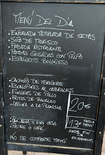 Read moreTras haber comido en este restaurante, decido dejar la peor valoración posible debido a la gran decepción que me provoca que un establecemento trate de reírse de sus clientes. Tras haber visto los platos ofrecidos en el menú del día, decido pedir de primer plato las patatas guisadas con "pulpo", tras probarlo, viene la gran decepción, no se trata de pulpo, del cual solo tiene el nombre, lo que han servido como tal es potón, que debido a tener una cierta semejanza y un precio mucho menor, han intentado colarlo como tal a ver si cuela, en la mayoría de casos probablemente será así, pero para alguien de Galicia acostumbrado a comer pulpo de verdad pues no cuela, también decir que llevaba alguna gamba (3 han tocado en una ración para 2 personas) pese a esto, he de decir que el guiso tenía un buen sabor y una buena preparación, pena que no hayan utilizado pulpo de verdad. El segundo plato pedido fueron escalopines al Cabrales, plato de buen sabor y calidad, destacar la salsa de Cabrales, especialmente buena. El postre fue tarta de almendra muy buena también, pero una ración un tanto escasa quizás. Como resumen general, decir que es un restaurante donde se sirve buena comida, raciones de un tamaño normal, pero una pena llevarse la decepción de que traten de vender algo como lo que no es, ya que el pulpo y el potón, poco parecido tienen tanto de sabor como de aspecto para alguien...