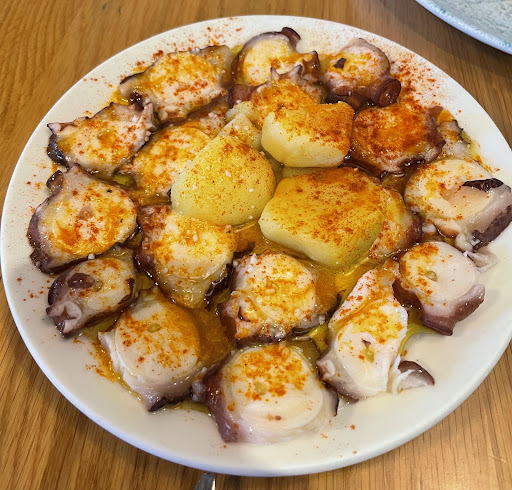 El menú de Dos Chata es variado y se centra en la cocina mediterránea y española, con opciones vegetarianas y veganas disponibles. Entre sus especialidades destacan las tortillas, que son muy apreciadas por su sabor y textura. Otros platos recomendados incluyen el pulpo, la carrillada y la lubina al horno. Los ingredientes son frescos y de alta calidad, lo que se refleja en el sabor de los platos. Nosotros hemos comido un delicioso pulpo a feira, unas zamburiñas frescas a la plancha y unos huevos rotos con gulas y gambas.