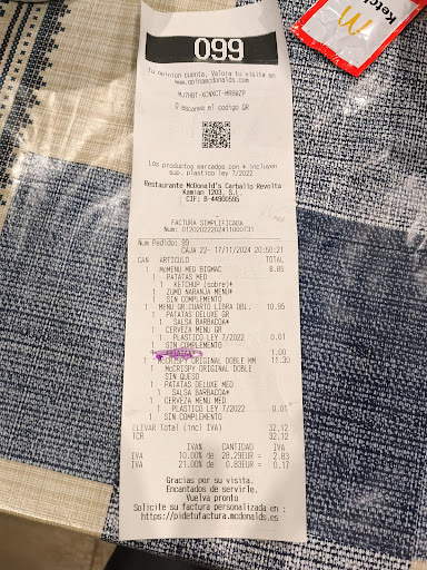Drive Thru Order - it's maybe a wrong impression because I am a foreigner, but the lady at the drive-thru had an inquisitive, indiscreet gaze. But that's not so important. Also, although I am a foreigner, I do speak Galician perfectly and almost without accent. I was so surprised when staff was unable to attend to me in the local language and spoke only Spanish. After all, Galician is the prevalent language in the Carballo area and is widely spoken and expected. All in all, it was quite ok but not as quick as other Macdonalds I've been to. Food was average but very hot, which was excellent. Maybe they need time because they just started a few weeks ago. It will surely...