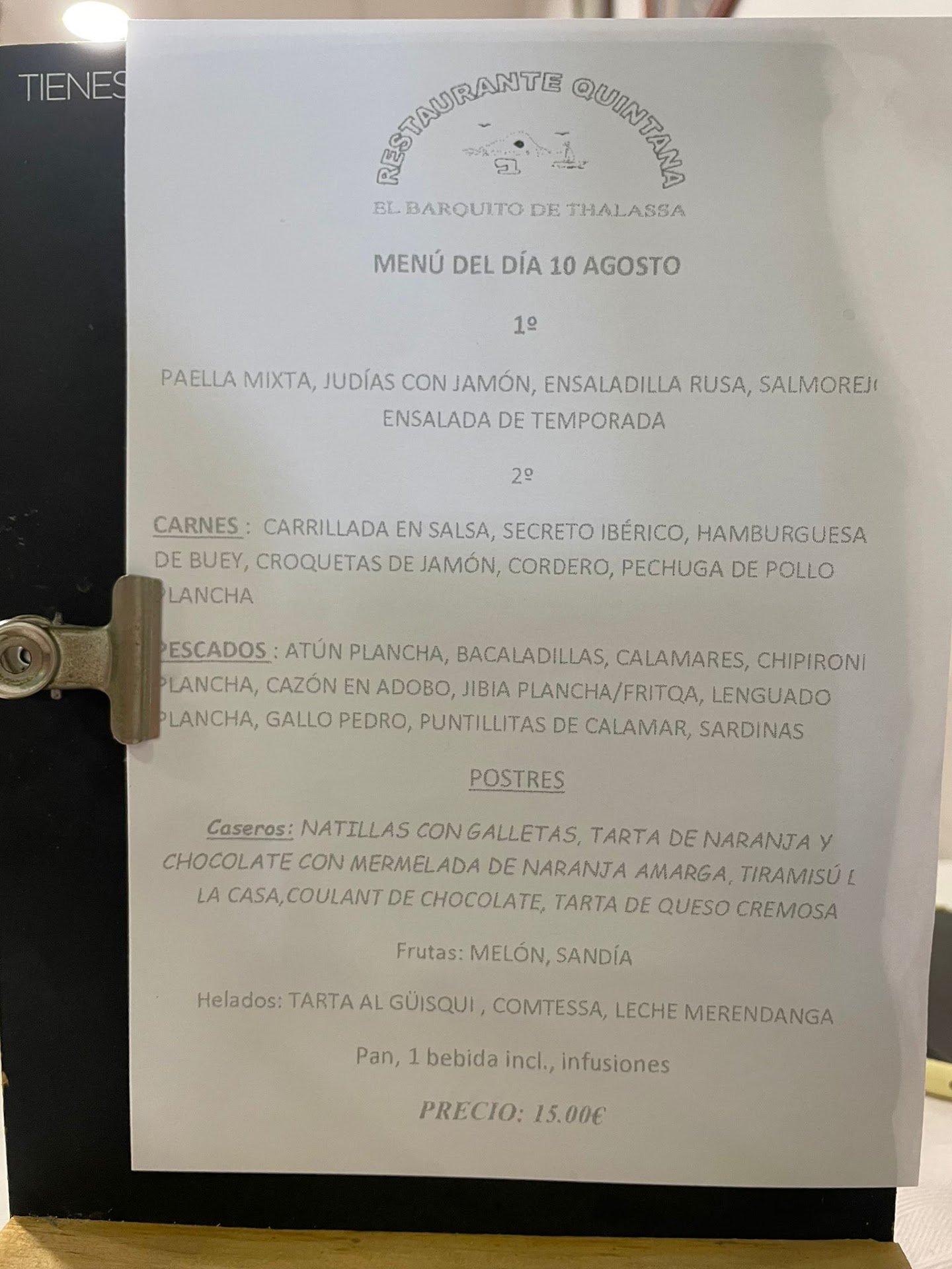 Solo tienen menú del día, por 15€, primero plato, segundo plato, bebida y postre.