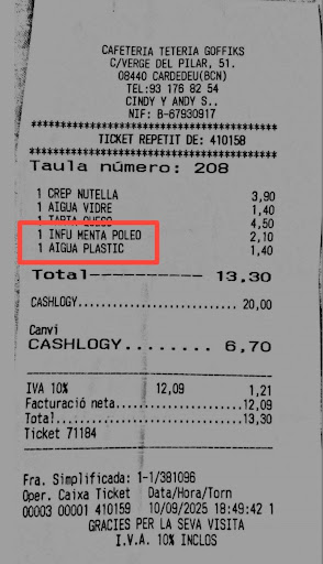 Si alguien quiere experimentar cómo es que te tomen por imbécil en directo, este es vuestro lugar. La Cafetería Goffiks ha perfeccionado el arte de vender agua del grifo a precio de champán francés. Pido una infusión de menta poleo. Normalmente, eso significa: sobrecito + agua mineral caliente. Aquí no: aquí significa sobre barato + agua de grifo. Agua que sabe a caldera oxidada. Y como yo no soy de los que disfrutan de beber lo mismo que baja por el fregadero, les pido que me hagan la infusión con agua mineral. ¿Qué hacen? Te cobran la infusión del agua del váter + 1 botellín de agua mineral. Negocio perfecto: doble factura por un único vaso.