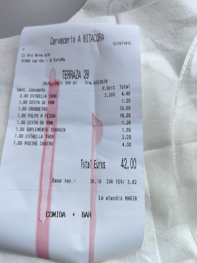Nos acomodo en la terraza, en una mesa en la que nos mojaba el orballo, "porque es Galicia", y nos cobraron un suplemento de terraza que NO se indica en la carta. Además de haber tenido que pedir que nos entregarán el recibo al pagar.