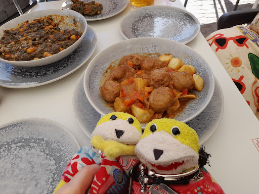 After a stroll around the old town Casta brought us back to the square / circle. Stopped for a drink and some food. Beer, wine and vermouth. Booth ordered meat balls and also a spinach/chickpea combination. Large portions at 10€ each. Two dishes fed three of us. Enjoyed it. Plenty of local Spanish people. Pavement seating spills onto the road. Big beer 3€, wine 2.8 and...