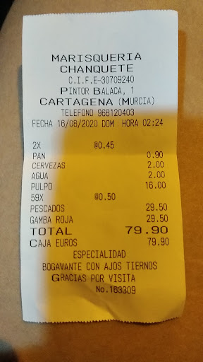 Read moreEs un lugar interesante para comer si visitas Cartagena. Está situado en una buena zona de la ciudad, cerca del Corte Inglés y pegado a una de las principales avenidas de la ciudad. El local es pequeño, pero dispone de una terraza situada en la acera, en una calle que no tiene mucho tráfico. El personal muy cualificación, amable, dispuesto y profesional. La comida es lo mejor, de una calidad precio alta. Los Chanquetes, tanto en tortilla como al ajillo están espectaculares, hacen honor a su nombre. Una carta de marisco y pescado no muy extensa, pero muy práctica, tiene lo que tiene que tener. Nosotros pedimos Chanquetes al ajillo, casi parecen angulas, un pulpo a la gallega con toque murciano, rico y mero a la plancha con verduras... Especial. De postre, una tarta de chocolate casera y arroz con leche casero... Muy buenos. El precio, no es barato, pero para ser sábado y comer a la carta... 30 euros por cabeza, con las bebidas incluidas:...