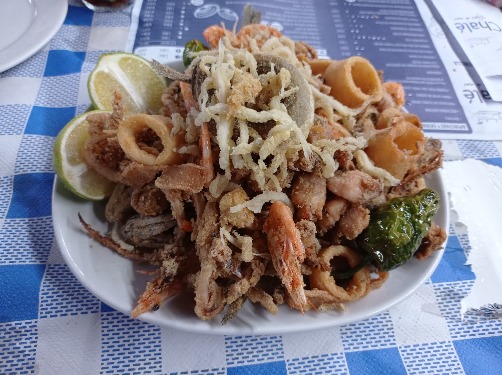 Lugar cerca del mar para comer o cenar donde el protagonista es el pescado Pedimos un pulpo a la cartagenera que estaba muy rico, aunque los trozos eran pequeños y la cantidad muy justa. Seguimos con unos mejillones sencillamente deliciosos. Cómo no podía ser de otra forma pedimos dos frituras y aquí vino la sorpresa. La fritura viene presentada en un plato demasiado pequeño, el pescado más grande colocado debajo. Nos pareció que le faltaba sal, las quisquillas muy buenas, los boquerones aceptables pero los salmonetes....nada de frescos, secos y con sabor a pasado. El resto del pescado del fondo de la fritura insípido, a las seis personas nos pareció de muy mala calidad. Se lo comunicamos al camarero, un chico muy profesional, y literalmente nos dijo que en cocina habían pasado del tema. Gran decepción nos hemos llevado de este sitio. Los postres aceptables, pan de calatrava, flan de coco y tarta de tres chocolates hecha con termomix. Chupitos de garrafón.Otro detalle a cuidar es que el limón que acompaña a los platos.... secos y poco presentables, al igual que las rosquillas del pan que estaban blandas. No volveremos a comer pescado en este sitio ni tampoco lo recomiendo, hay sitios donde el producto es de mucha mejor calidad. Lo mejor de la cena los mejillones y las gominolas.....una pena.