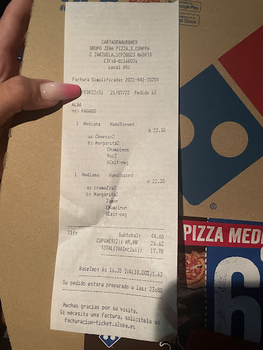 Read moreNuestra visita a este Domino's (Av. Juan Carlos I, 47, 30310, Cartagena) ha sido, sin duda, una de las peores experiencias que he tenido en un restaurante. Pedimos dos menús "Come y Bebe". De entrada, nos advirtieron que las pizzas tardarían el doble de lo habitual, a pesar de que el local estaba casi vacío (solo otras dos mesas ocupadas). Aunque esto ya fue un mal comienzo, lo que siguió fue mucho peor.