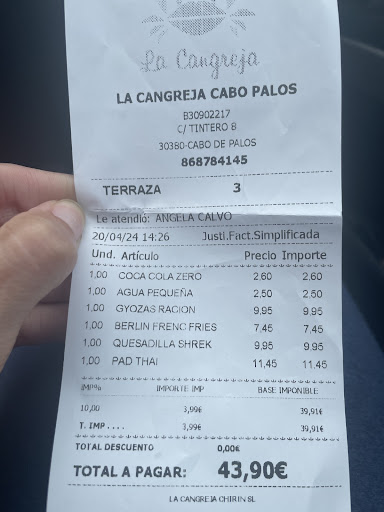 Read moreSalimos de aquí DECEPCIONADOS. A este lugar le dan mucho bombo en redes sociales pero NADA MÁS LEJOS DE LA REALIDAD. A su favor diré que la atención si es buena. Pedimos una ración de Gyozas tikka massala una ración de patatas Berlín Frenc fríes, 1 quesadilla shrek y 1 pad Thai. La comida a la vista parece buena pero al comerla deja mucho que desear. Las raciones DE TODO eran pequeñas para el precio que tienen es una verdadera estafa. Las Gyozas no tenían apenas nada de relleno era casi todo masa y una salsa que le pusieron que sabía a todo menos a tikka Masala y la quesadilla chorreaba aceite por todos lados y para poner la guinda del pastel el Pad Thai estaba grasiento y tiene una mezcla de sabores que eso no hay por donde cogerlo. Mezclar los fideos de arroz con chipirones rebozados con crema de cacahuete entre otras cosas es lo peor que he comido en mi vida. He comido más aceite que en todo lo que llevo de año tengo hasta ganas de vomitar. Pues la fiesta junto a una Coca-Cola cero y un agua pequeña nos ha salido por 43,90 €. ¡Ojo y sin postre! Si llego a pedirlo me dejo allí más de 50€. De verdad no cometáis el error de venir aquí, hay sitios en la manga que le dan 100 patadas a este. Mal futuro le auguro a este sitio. Nosotros desde luego que no volveremos y de verdad que no os lo recomiendo para nada. No hay nada peor que comer en un sitio donde sientes que has tirado tu dinero y has pagado por algo que...