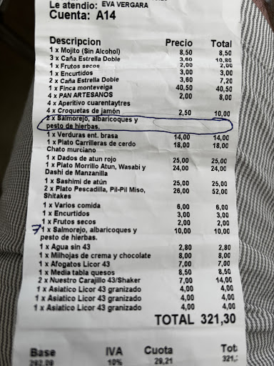 Read moreAn exceptional location and a fabulous venue. What should have been a great culinary experience ended up being a huge disappointment: we had a couple of pre-dinner drinks that were served with two little dishes (one of salted almonds and one of olives). Half the party arrived late so we asked for another of these two little dishes. We thought these were complimentary. We were wrong: they charged 10€ for these in the final bill. A small bread basket was placed on the table. Free? Nope, this was charged at 8€. Starter of “The best Salmorejo in the world”came with a generous helping of cling film inside. Spoke to the manager who apologised, proceeded to replace it and then charge us for both. We had to complaint (again) to have them remove the charge from the bill. Half the starters arrived after the rest of the guests had eaten theirs. Mains were really nice and so were desserts and asiatico coffees. After our initial complaints we were expecting some small gesture (a complimentary coffee would have done it). Instead, we had to point out that they charged for the salmorejo (with plastic) for them to remove the charge for this and its replacement. We found it appalling that we were charged for the olives, nuts and bread and not a single thing was given as a good will gesture. We provided feedback on the spot. Politely; and quietly decided never to return. Would love to recommend this restaurant (i really would) but service needs to be better for us to do so, specially at this price point. Pity as a single gesture could have reversed our really...